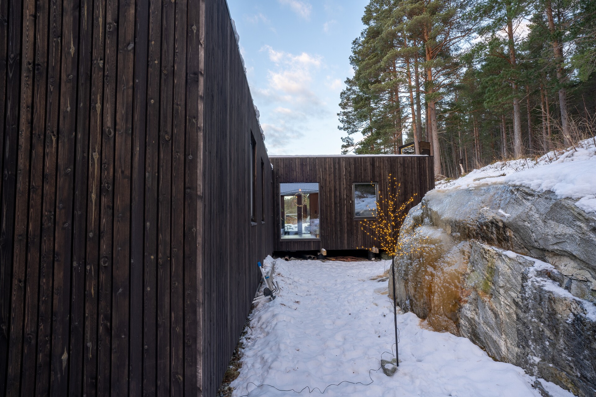 Ingrid og Terje gikk for herlig sammensetning på fasaden, med svart kledning som hovedfarge, og naturfarget kledning som kontrastfarge på den ene endeveggen og langs vinduene på fremsiden av huset.