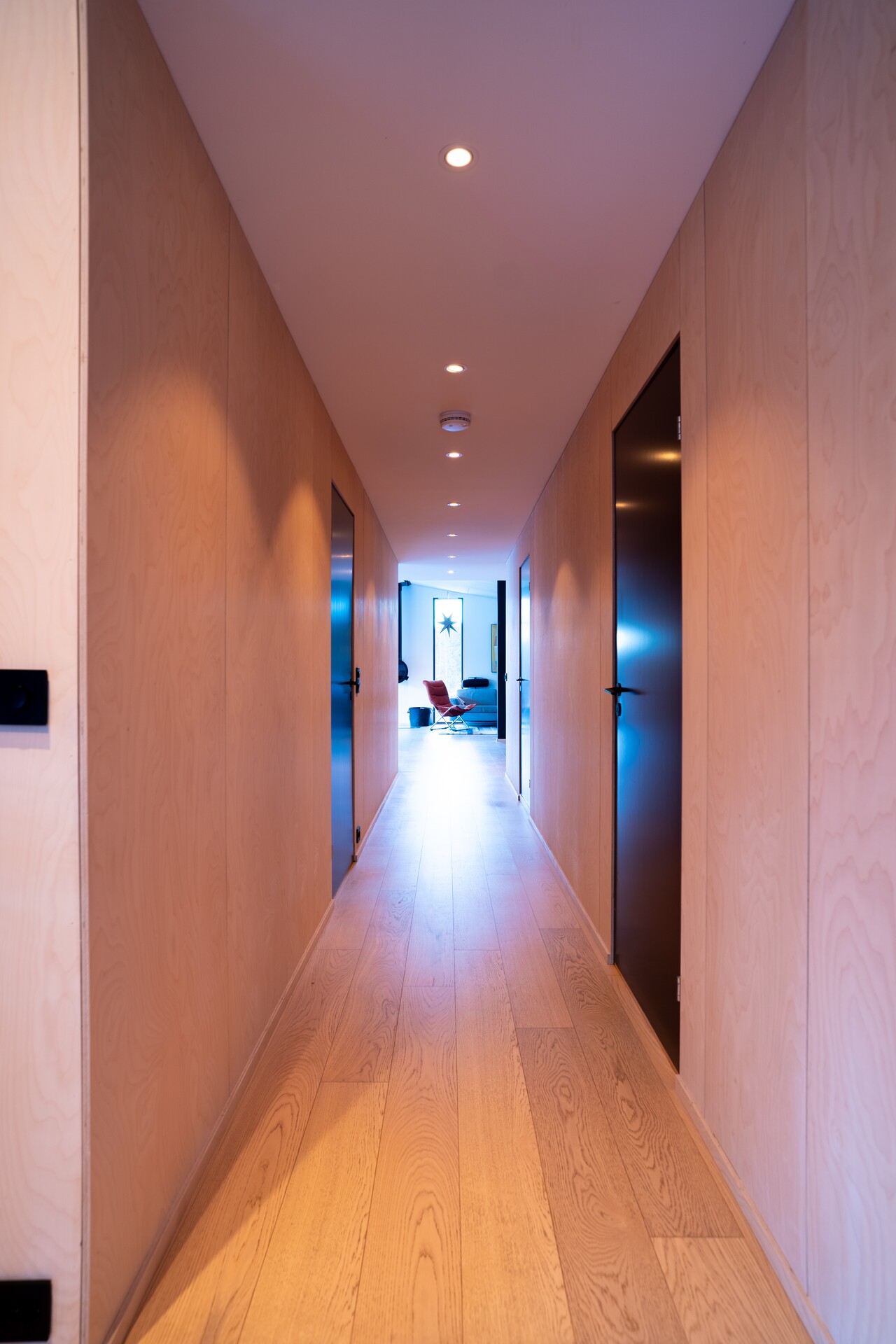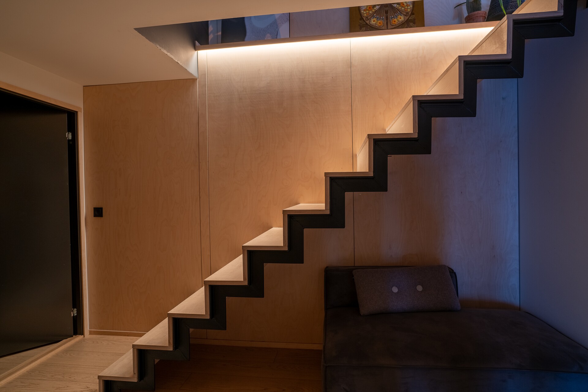 Ellers kunne fagmannen Terje gjenbruke rester etter bjørkefinerplatene de har brukt som innvendig panel til å lage gulvlister. Et godt eksempel på en liten, men god idé, som gir et gjennomført og helhetlig uttrykk.